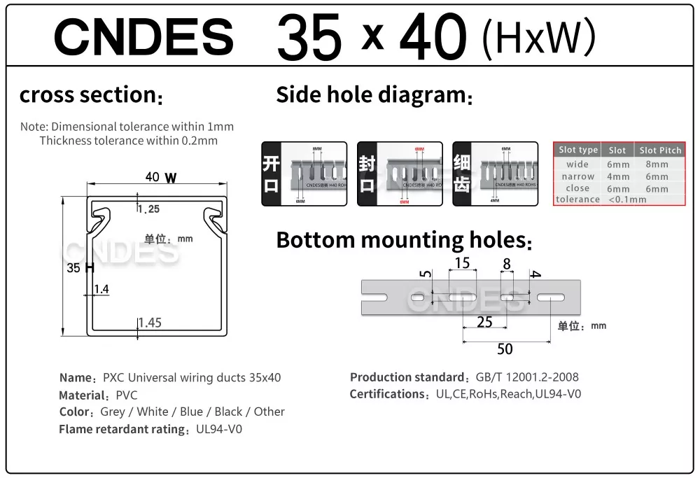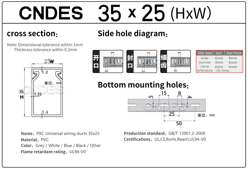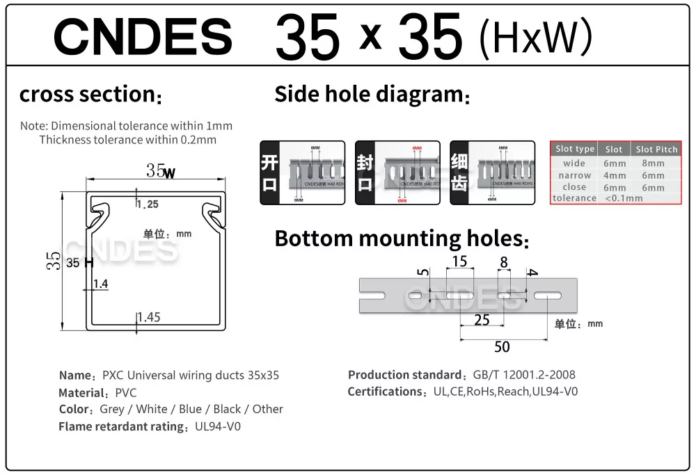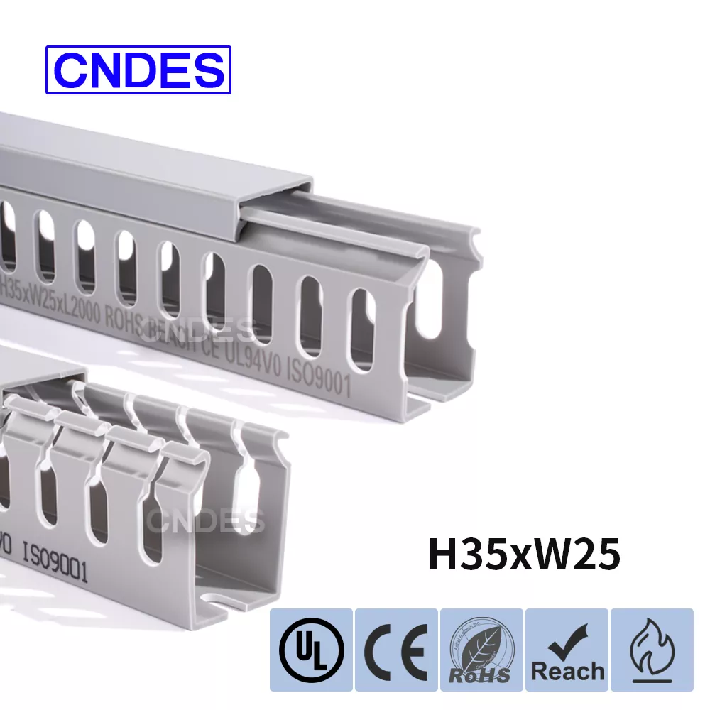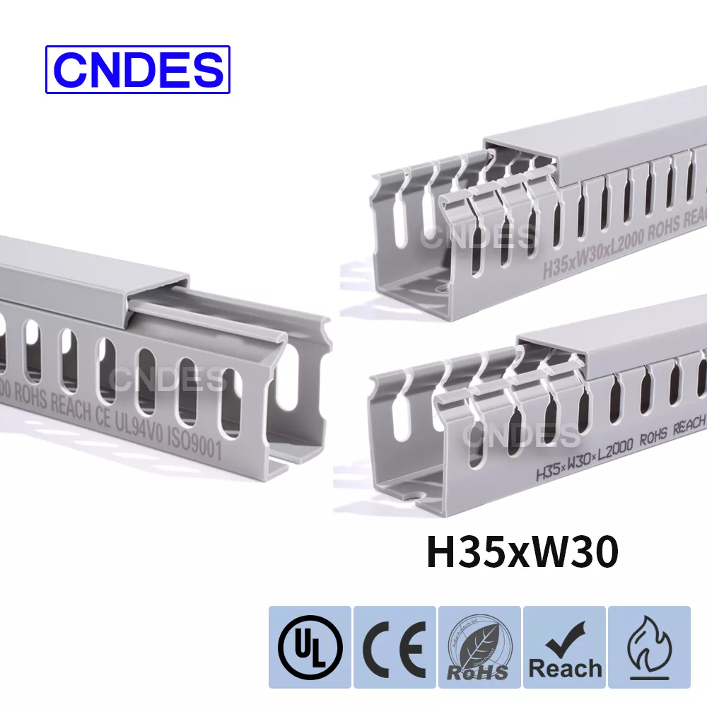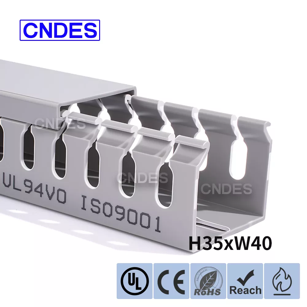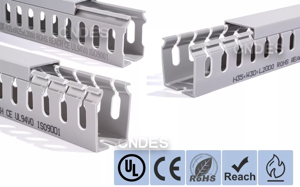 O duto de passagem de fio de PVC com fenda de 35 mm de altura personalizado, fabricado pela empresa chinesa CNDES, consiste em uma base de PVC rígida e uma tampa removível. A base apresenta ranhuras equidistantes em forma de dedos estampadas em ambos os lados, formando “dentes de pente”. Esses dentes podem ser quebrados manualmente, permitindo que o fio saia horizontalmente de qualquer posição. A tampa se encaixa facilmente no lugar, mantendo uma aparência elegante. Uma fileira de furos de montagem na parte inferior está em conformidade com o espaçamento padrão DIN 43659. Ele pode ser rapidamente fixado em painéis, estruturas de gabinete ou estruturas semelhantes usando parafusos ou rebites M5.