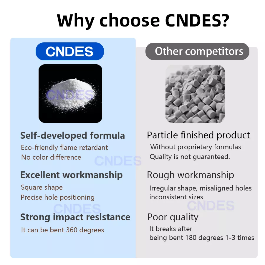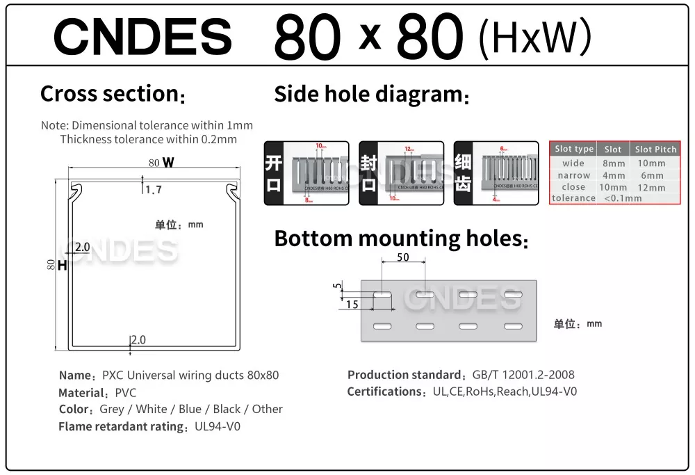 Quando as bandejas de cabos padrão não acomodam chicotes elétricos complexos, o duto de fiação do quadro de distribuição de PVC com fenda 80 × 80 personalizado do CNDES é sua boa escolha. Com um grande espaço interno de 80 mm * 80 mm, ele foi projetado especificamente para cenários de alta demanda, como cabeamento de backbone de data center, clusters de energia de equipamentos industriais e fiação centralizada em grandes gabinetes de controle. Ele acomoda e organiza facilmente um grande número de cabos, despedindo-se de uma vez por todas da desordem e do congestionamento.